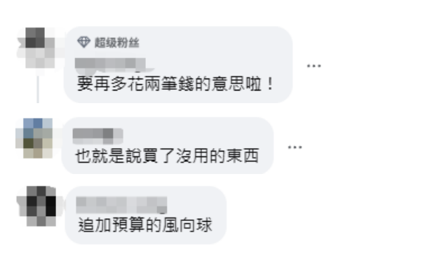 针对此事,有岛内网民在社交平台脸书留言吐槽,“要再多花两笔钱的意思”“也就是说买了没用的东西”“追加预算的风向球”。